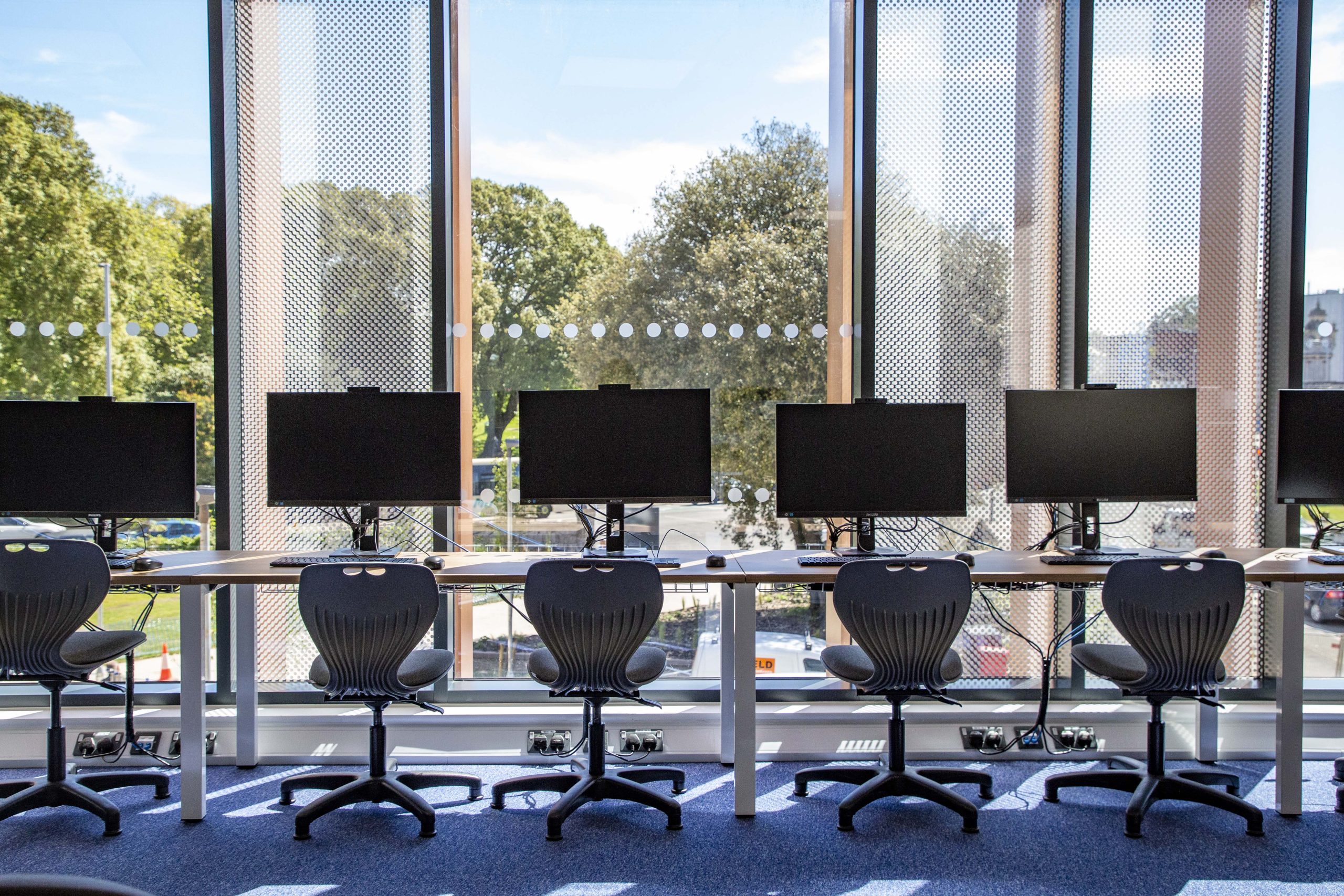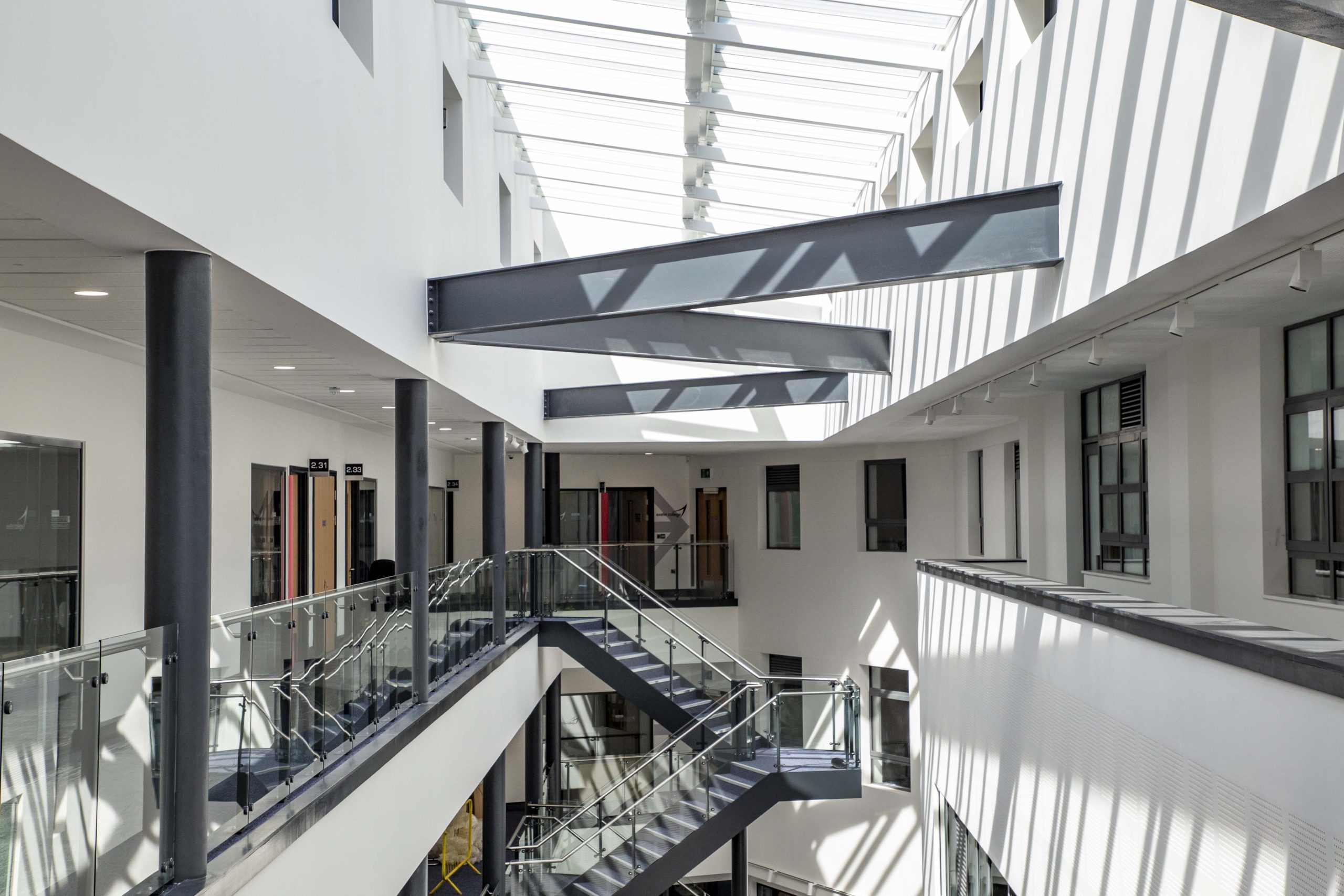 As part of a £70 million scheme, the 2,400 m² extension featured a central atrium connecting the two buildings, with dedicated exhibition space and a striking digital wall. The project also included a full refurbishment of the existing ground floor, creating new teaching spaces, a learning resource facility, a café, and a careers centre.
